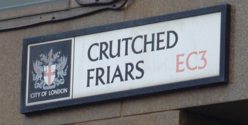 From there we can go to to Crutched Friars (an arbitrary choice as there are various friar-related streets), which takes its name from a holy order, the Crossed Friars. This was an Augustinian order that began in Bologna in 1169 and was established in London by Ralph Hosiar and William Sabernes in 1298. The name derived from the friars’ habits, which were blue with, usually, a red cross on the back.