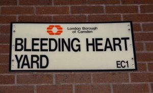 Starting with where my pursuit of London street names began: Bleeding Heart Yard. Dickens helped make the yard famous: there is a chapter in Little Dorrit entitled ‘Bleeding Heart Yard’. “The opinion of the Yard,” said Dickens, “was divided respecting the derivation of its name. The more practical inmates abided by the tradition of a murder.”