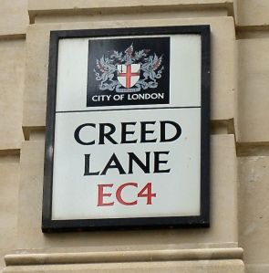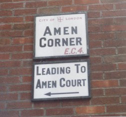 Amen Court takes its name, as do other streets in the St Paul’s area, from the fact that, before the Reformation, there was a regular procession of the clergy around the cathedral; this involved reciting the Lord’s Prayer in Paternoster Row, the Hail Mary in Ave Maria Lane, the Credo in Creed Lane, and the Amen in Amen Corner or Court. (The 60s group called Amen Corner took its name from The Amen Corner, a weekly disc spin at the Victoria Ballroom in Cardiff.)