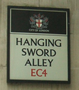 Hanging Sword Alley is also immortalised in Charles Dickens’ A Tale of Two Cities: Jerry Cruncher, messenger and odd-job man, had lodgings in the alley (“not in a savoury neighbourhood”.)